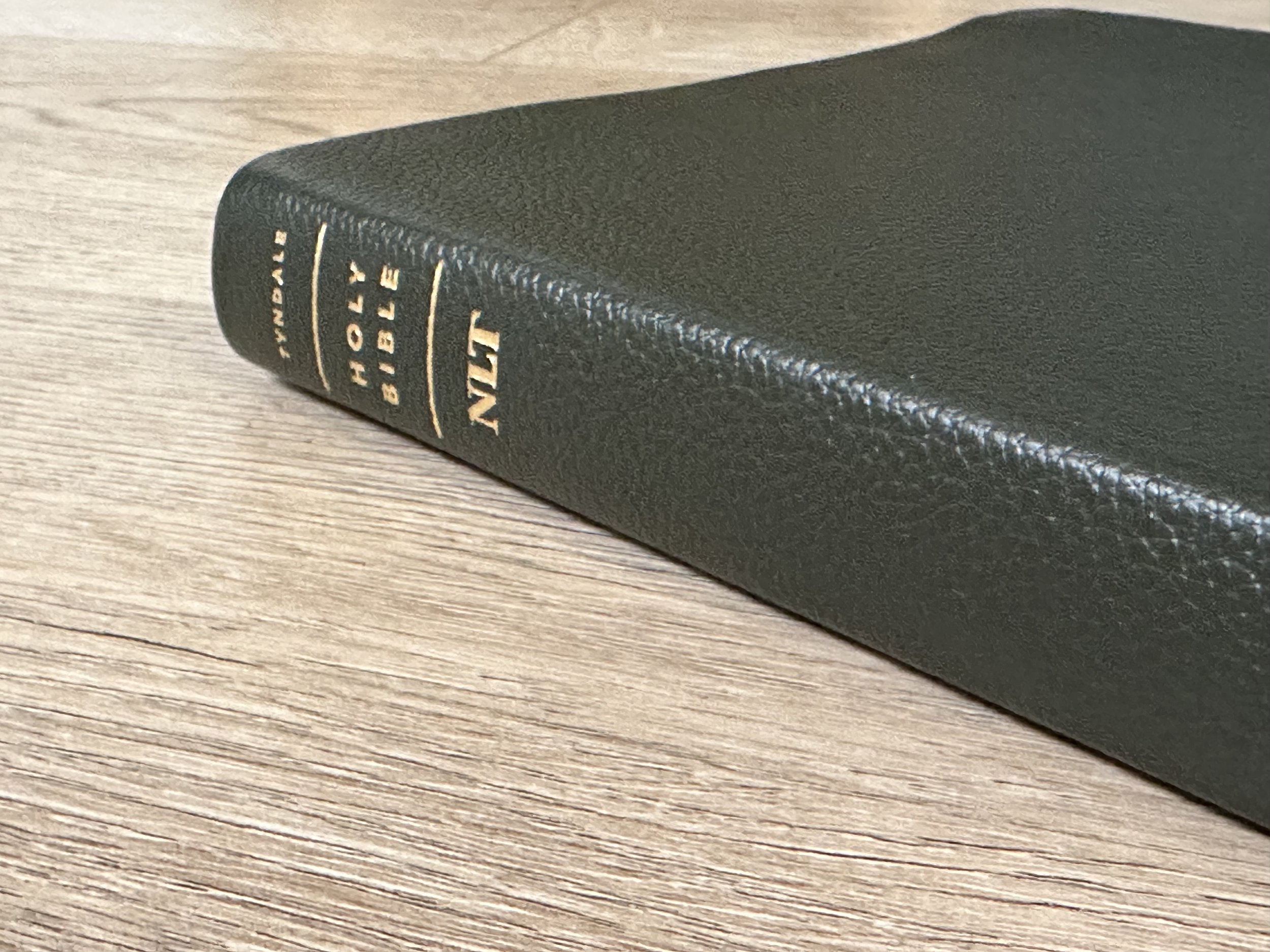 The genuine leather has a great feel. It’s nice and flexible. The color is a beautiful deep green that can almost look black in lower light. Tyndale always does a simple spine layout and I love the gold accent color on it and the page edges. This Bible features a lighter green head and tail band as well as a single light green ribbon bookmark.
