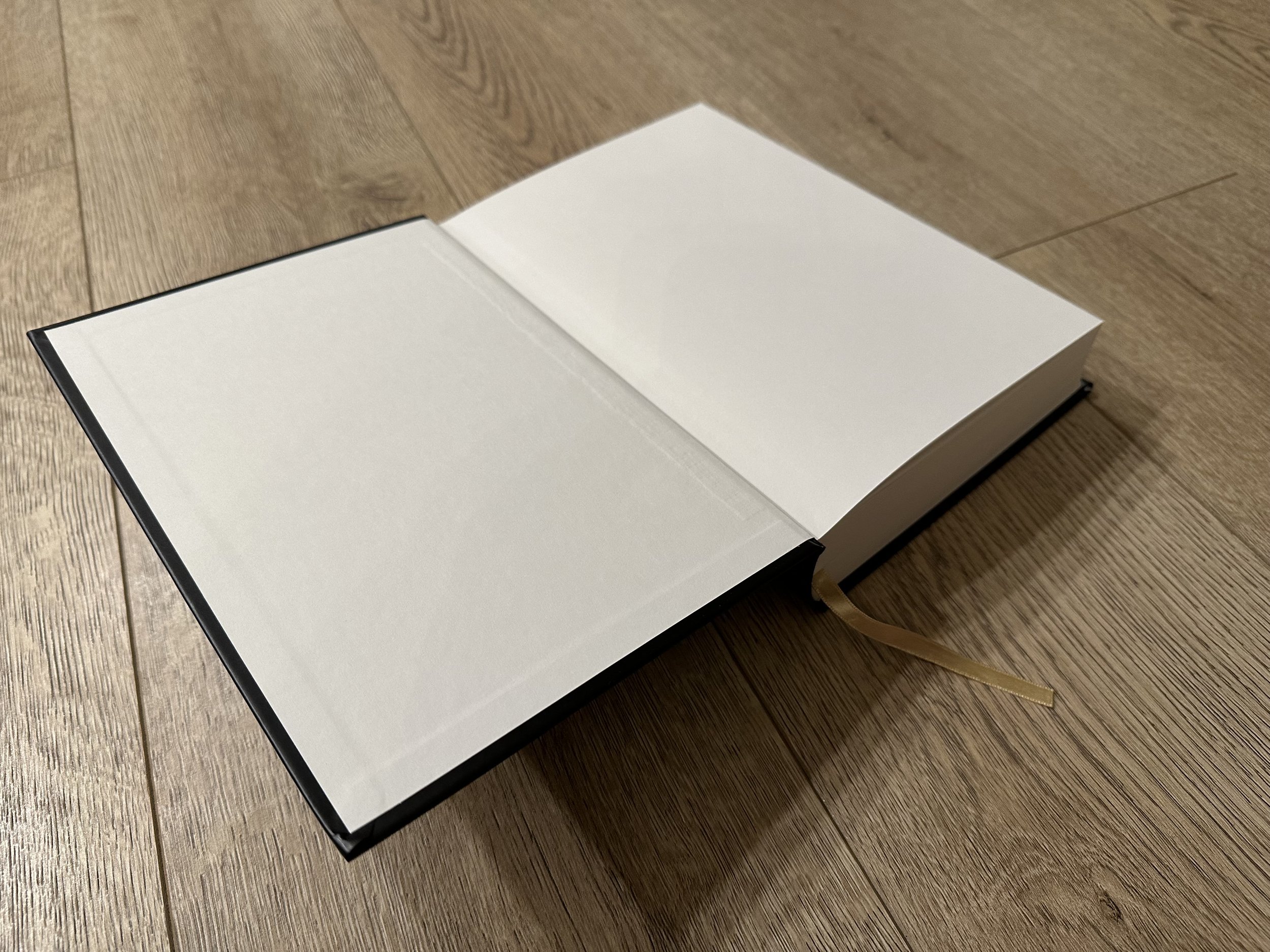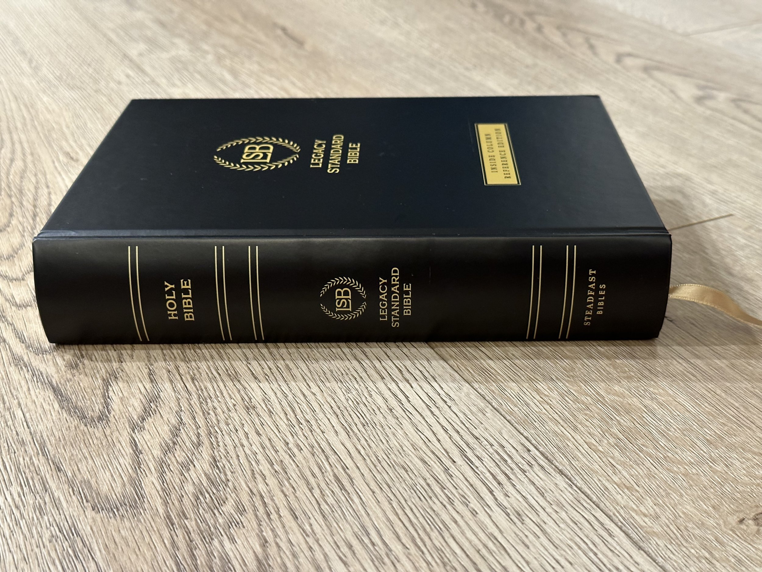 The cover itself has a black matte finish to it and in gold is the LSB logo, “LEGACY STANDARD BIBLE”, and gold rectangle with the words “INSDIE COLUMN REFERENCE EDITION”. On the spine in gold are the words, “HOLY BIBLE”, the LSB logo, “LEGACY STANDARD BIBLE”, and “STEADFAST BIBLES”. The page edges are white and there’s a single gold, double-sided satin ribbon bookmark. Inside is a white paper paste down liner. This Bible is going to be super durable as it’s Smyth-sewn with overcast stitching. This Bible was printed and bound in Korea.
