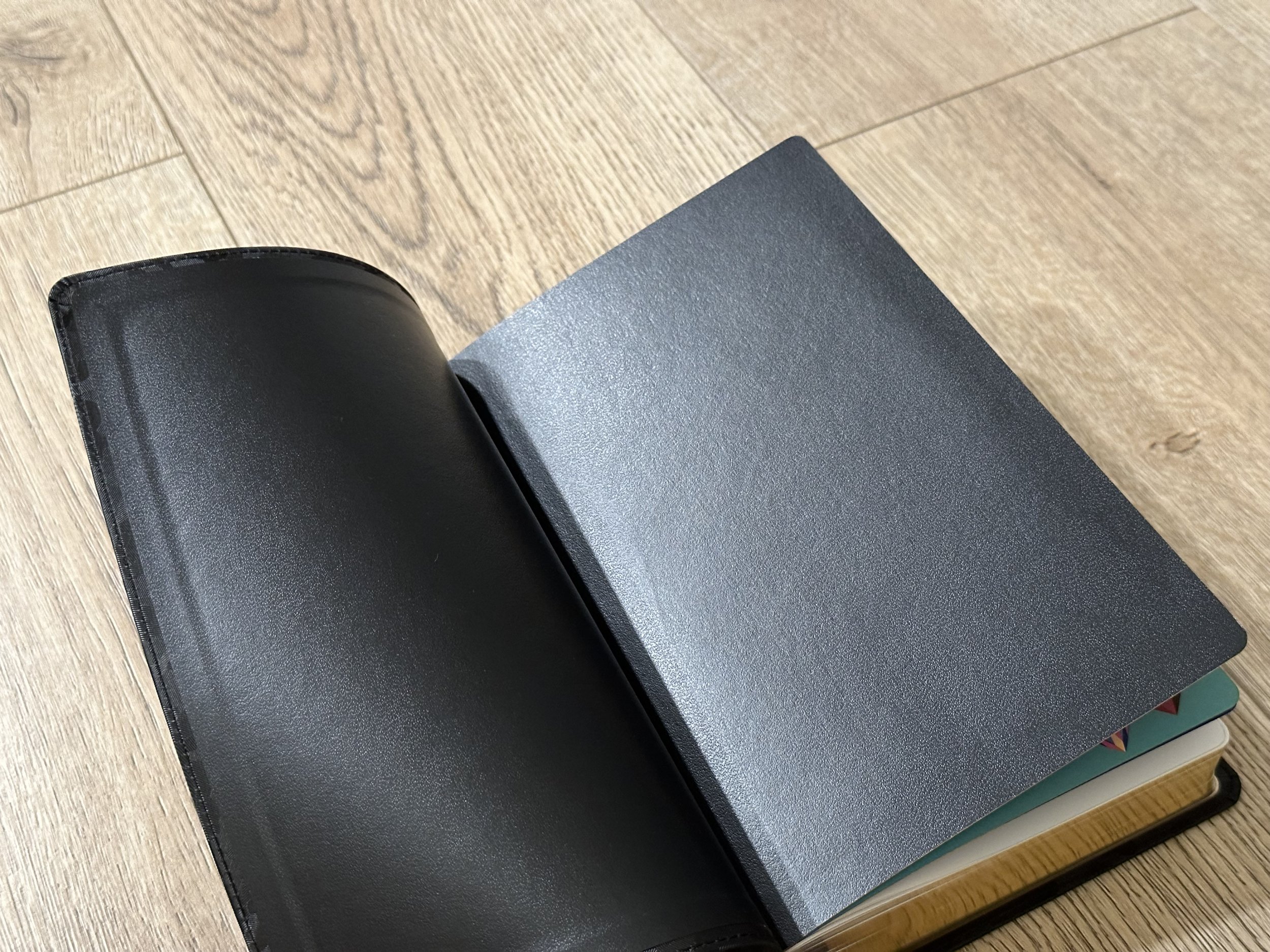I thought I’d be reviewing a cool camouflage Bible, which is unique enough in itself, but I was blown away by the reflective material used on this cover! It is sort of holographic and changes as you move it around. It’s really cool! Embossed on the front is “HOLY BIBLE” along with a diamond graphic. Embossed on the spine is “HOLY BIBLE”, the LSB logo, “LEGACY STANDARD BIBLE”, and “STEADFAST BIBLES”.