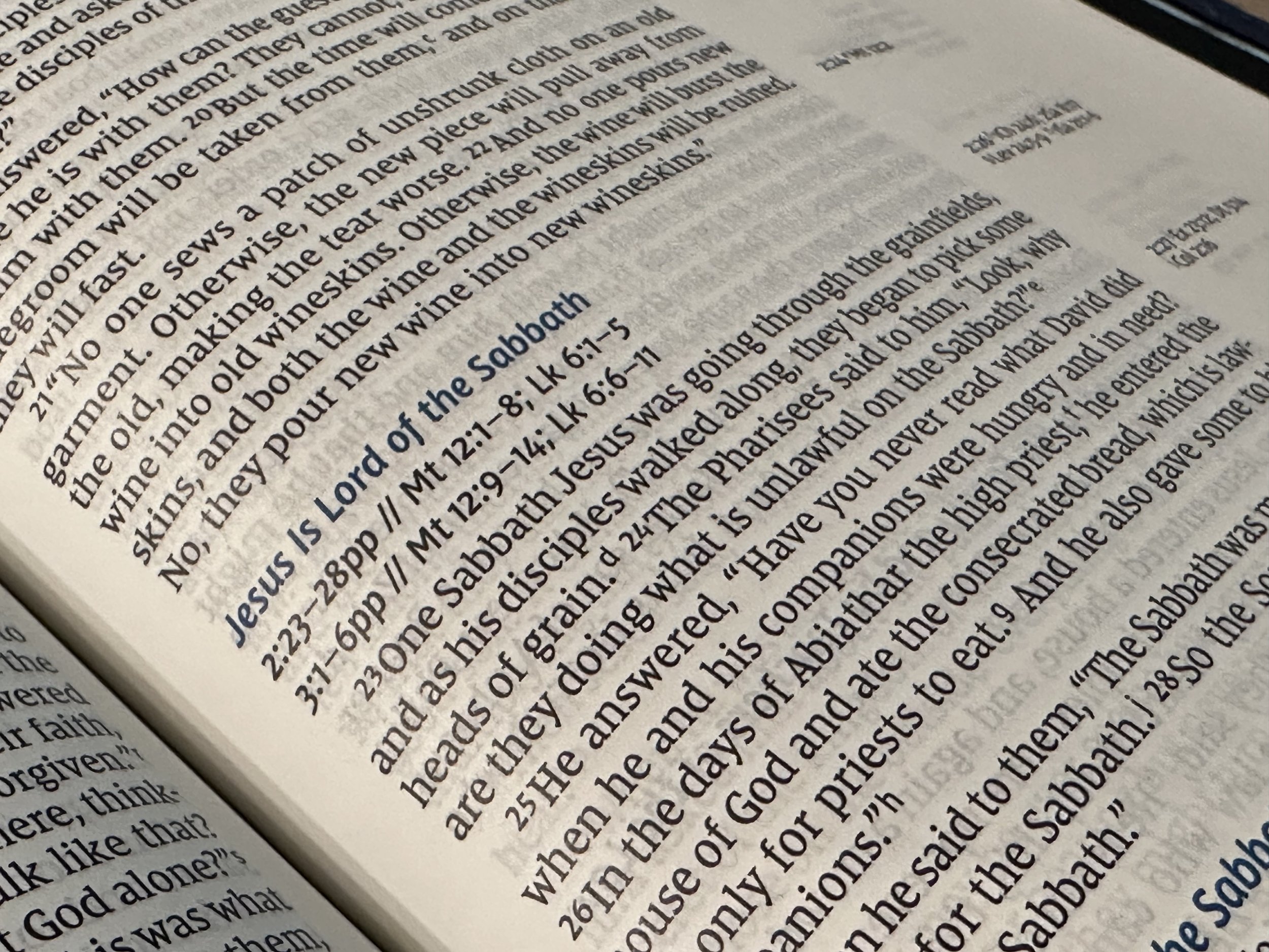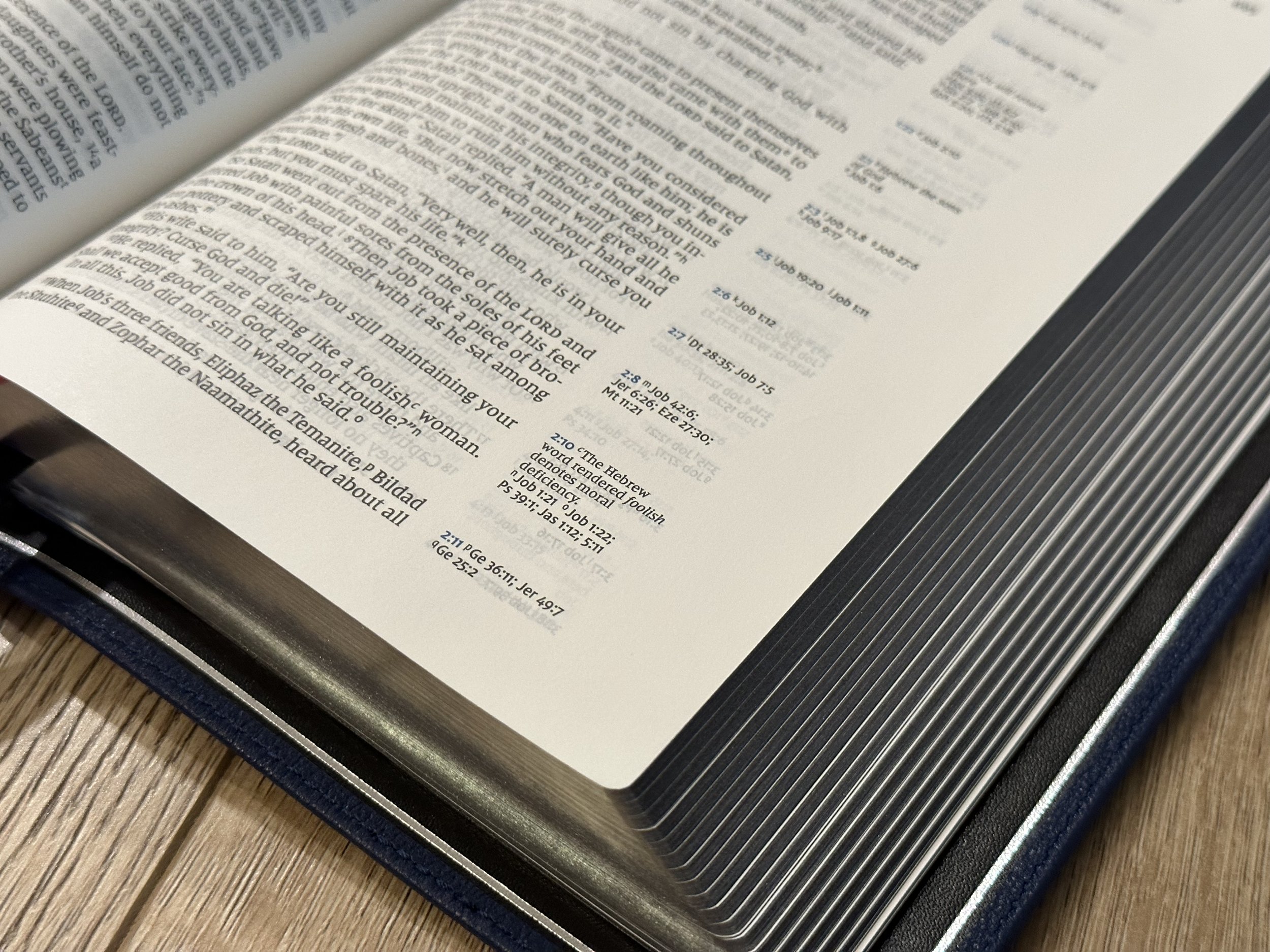 The inside of this Bible has it all! The text is in single-column paragraph format. It’s line matched. The type size 9.5 in the Zondervan NIV Comfort Print. References are on the outer margin and then there’s about an inch of margin room for note taking. This bible truly has it all. If that’s not enough, there’s a beautiful blue accent color for headings, subheadings, chapter numbers, and reference numbers.