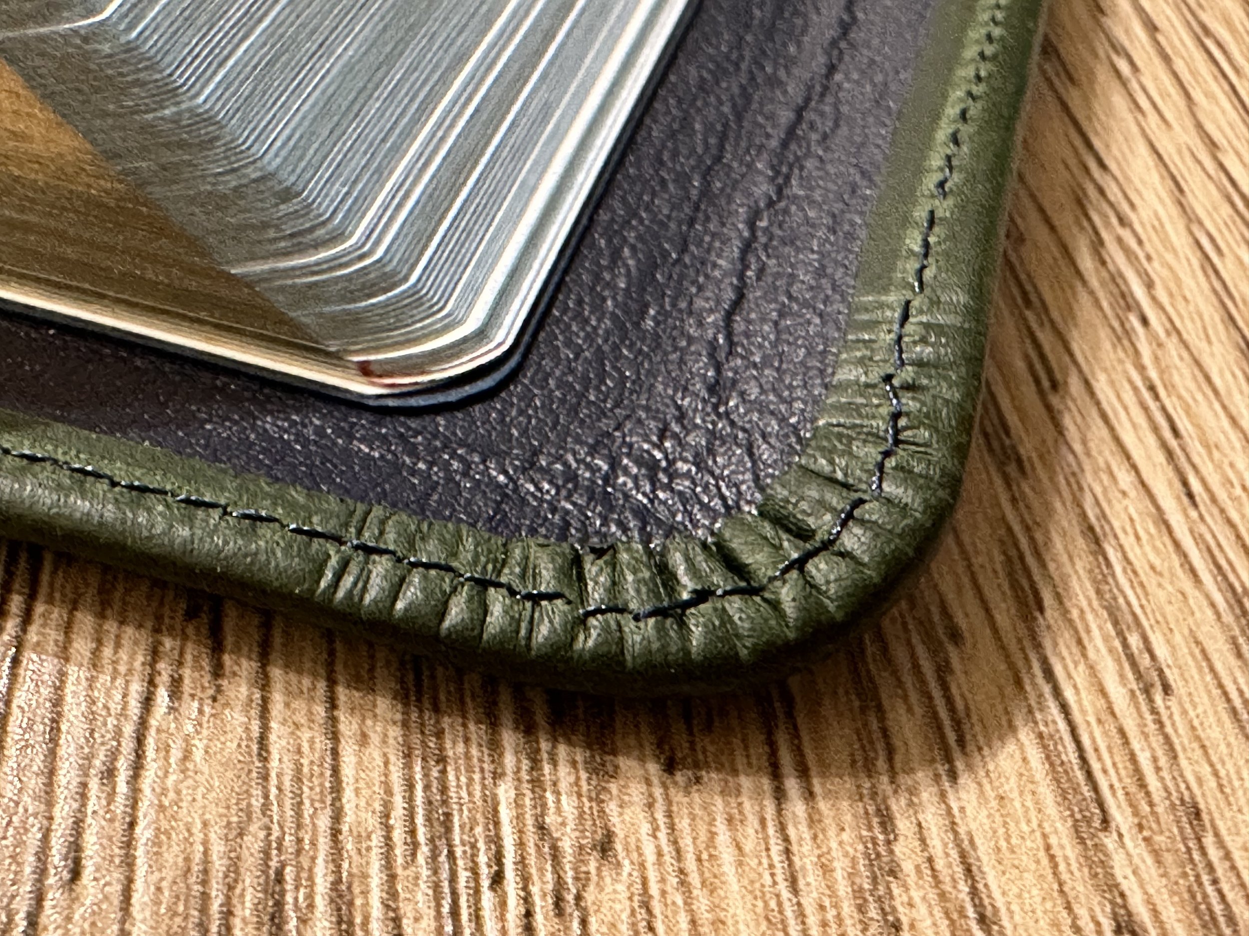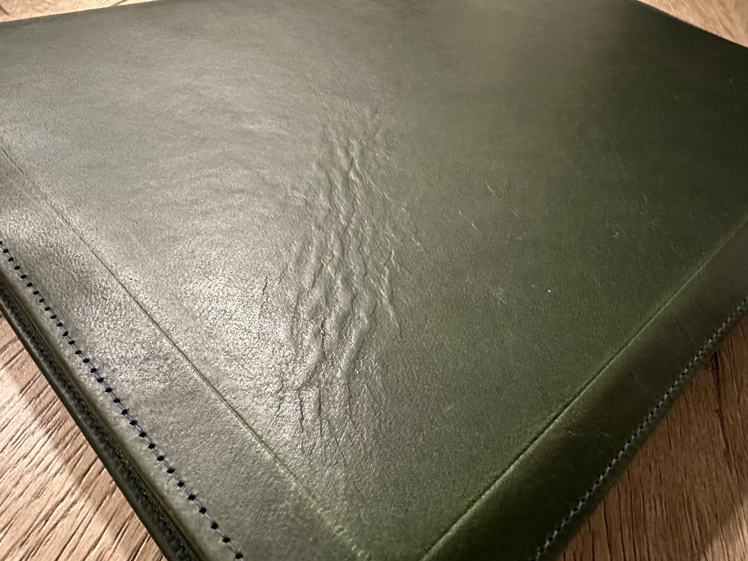 I ended up deciding to go with the Green Double Shot Leather. I had never encountered double shot before, but it’s a leather that I really like. It doesn’t have the grain of goatskin, but somewhat puts you in the mind of Horween. It has a bit of a matte feel to it and it develops some real character with use. However, it doesn’t seem as sensitive as Horween. The green is a nice emerald color and mine already is showing quite a bit of character on the front cover. Adrian did what I’d call a semi app and included a great looking tooled perimeter line to give the cover a bit of definition. He also did a blue perimeter stitching.