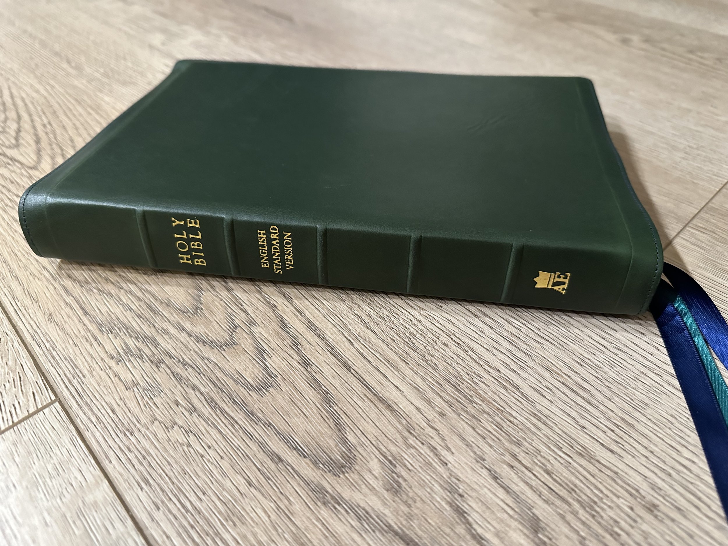 I kept the spine pretty simple with the words, “HOLY BIBLE”, “ENGLISH STANDARD VERSION”, and the AE logo stamped in gold. The double shot takes the gold stamp really well unlike Horween, which always seems to be blind stamped. Adrian also did five raised hubs. I like Adrian’s spine hubs a lot. They are thin and clean. They look really good on my thinner block.