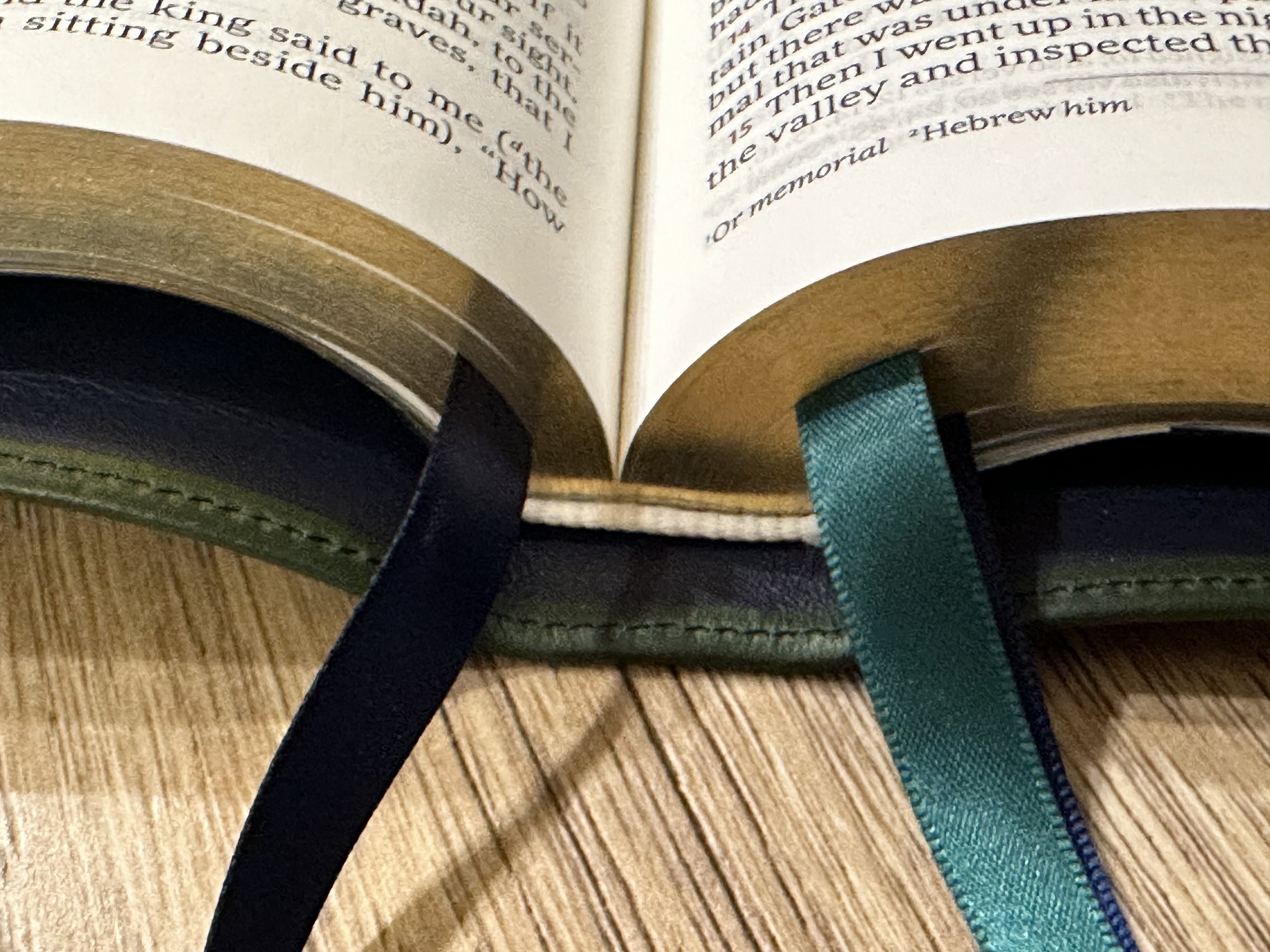 He went with white head and tail bands for this Bible and I love that choice because they really pop. He also included three long double-sided satin ribbon book marks with two being navy and one in green. I chose blue as the accent color for this Bible because the page edges are blue under gold and because green and blue are my favorite colors.