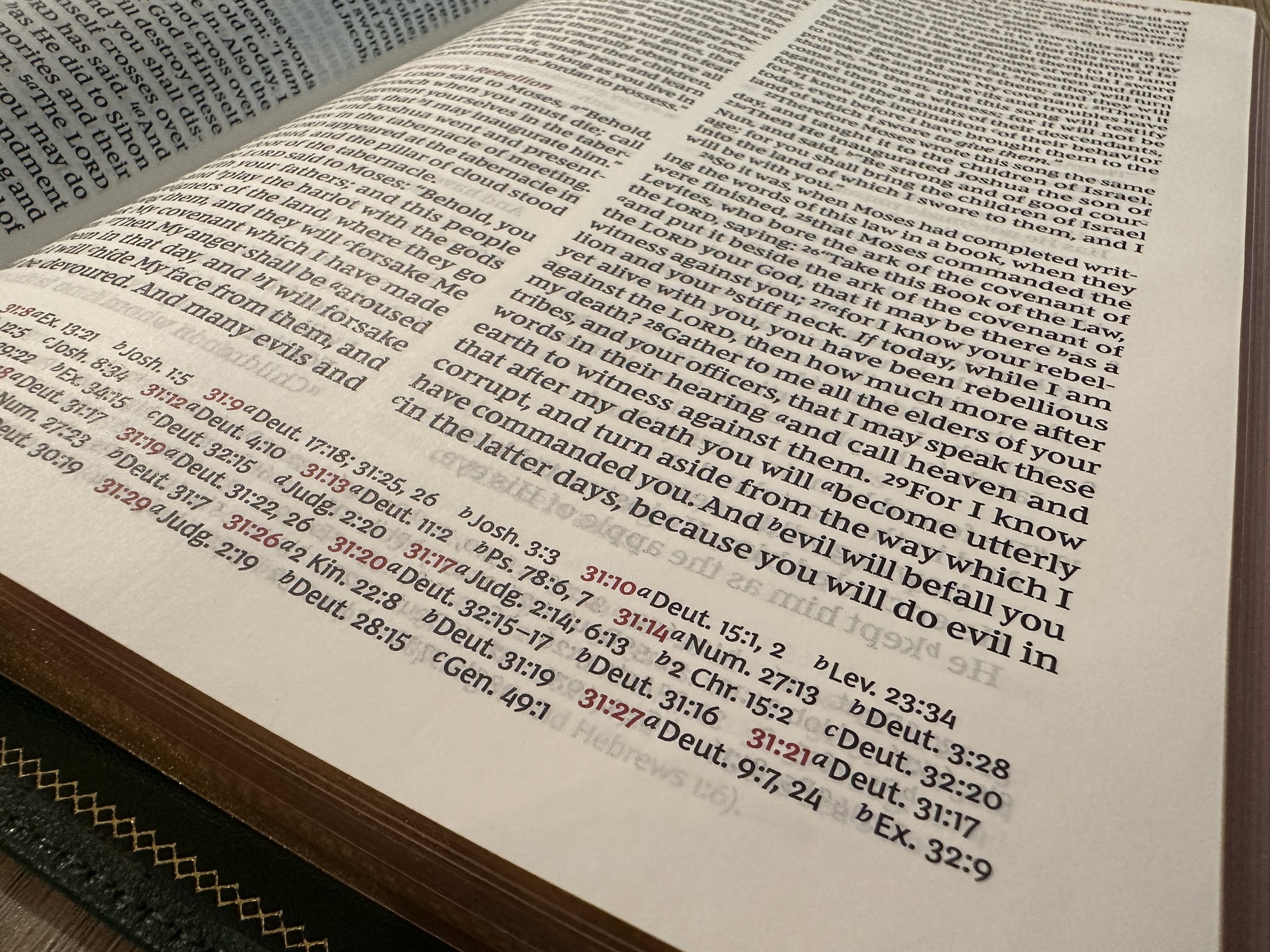 You get 36 gsm premium European Bible paper in this one. It’s line matched as well to help readability. I love that Thomas Nelson can consistently use 36 gsm paper and manage to keep their thinline Bibles thin. It’s certainly an art that other publishers need to achieve. This is a double column layout with an 11 point font in the NKJV Comfort Print typeface. Page headings, chapter numbers, subheadings, and cross-reference numbers are all accented in red. Words of Christ are also in red. This is a double column layout with cross-references spanning a single column at the bottom of each page.