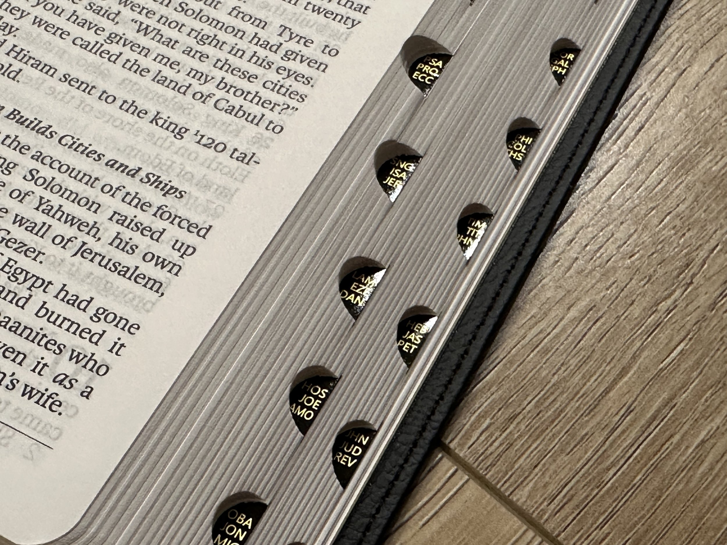 The page edges are white on this edition and there are recessed index tabs. Index tabs aren’t my preference, but I do think they’re useful and I certainly find myself making use of them at times when they’re there. There is one thin, gold double-sided satin ribbon in this edition.