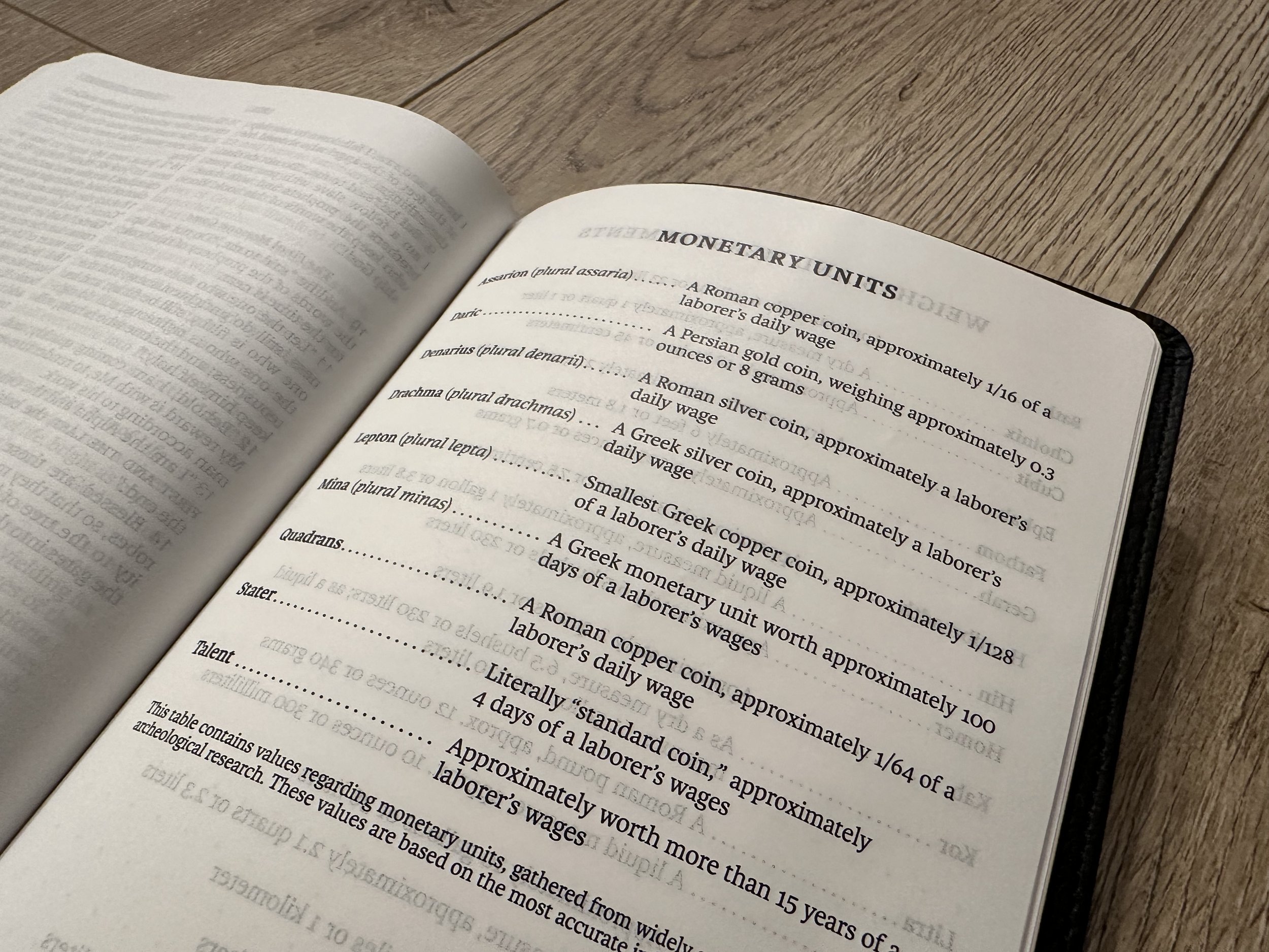 This Bible truly shines on the inside. You get a two column layout on 32 GSM paper that looks fantastic. It features a 10 point font and the words are line-matched for even better visibility. This is a verse-by-verse layout with bold verse numbers indicating new paragraphs. There are footnotes for weights, measures, and currency explanation. This is a great layout for a Bible! If that’s not enough, the back features 12 dot matrix pages for notes.