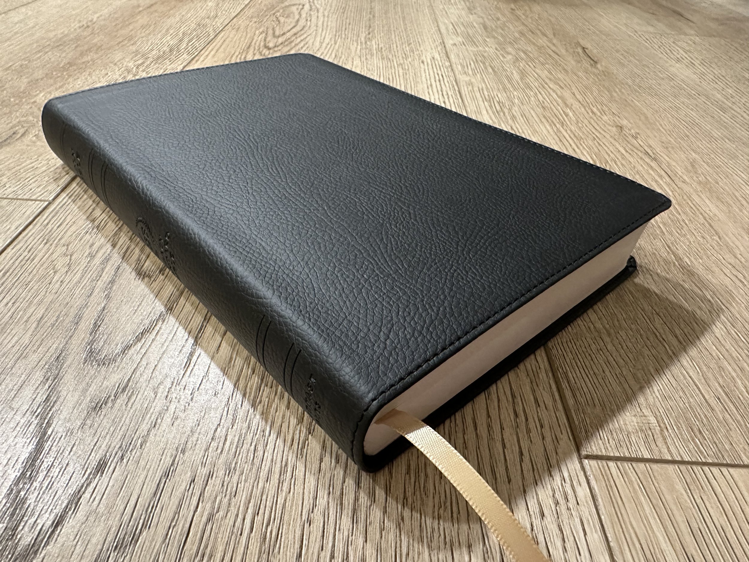 The spine is blind stamped so this has an all black look that I really love. The spine also has a really clean look. One thing the LSB design has done is go asymmetrical with the spine hubs or stamped bars. This one has blind stamped bars that feature three on the top and two on the bottom. They’re spaced so there is a lot of room for the LSB logo as well as the words “LEGACY STANDARD BIBLE”. This really sets that logo off and creates an awesome look you don’t see on many Bibles.
