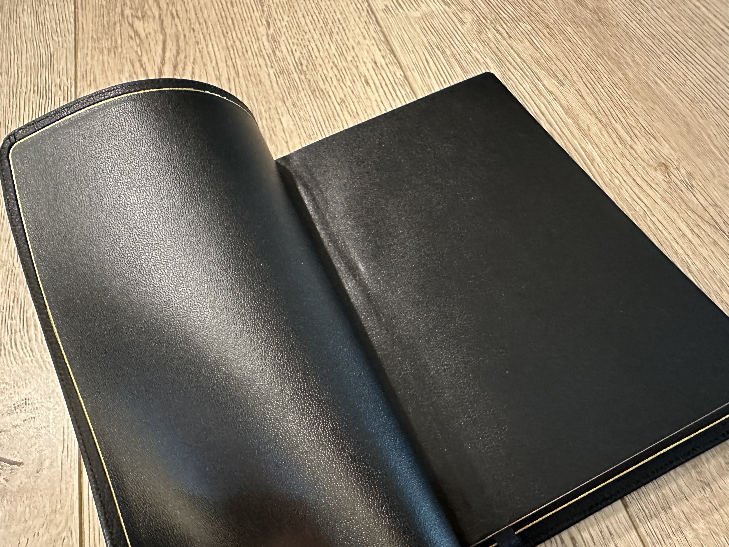 Inside you’ll find a nice black calfskin liner with a gold perimeter gilt line. There are black vinyl end sheets. This Bible also has a set of family records pages, which might be an odd choice for a compact. the Bible is both edge-lined and Smyth-sewn for durability and comes with a lifetime guarantee.