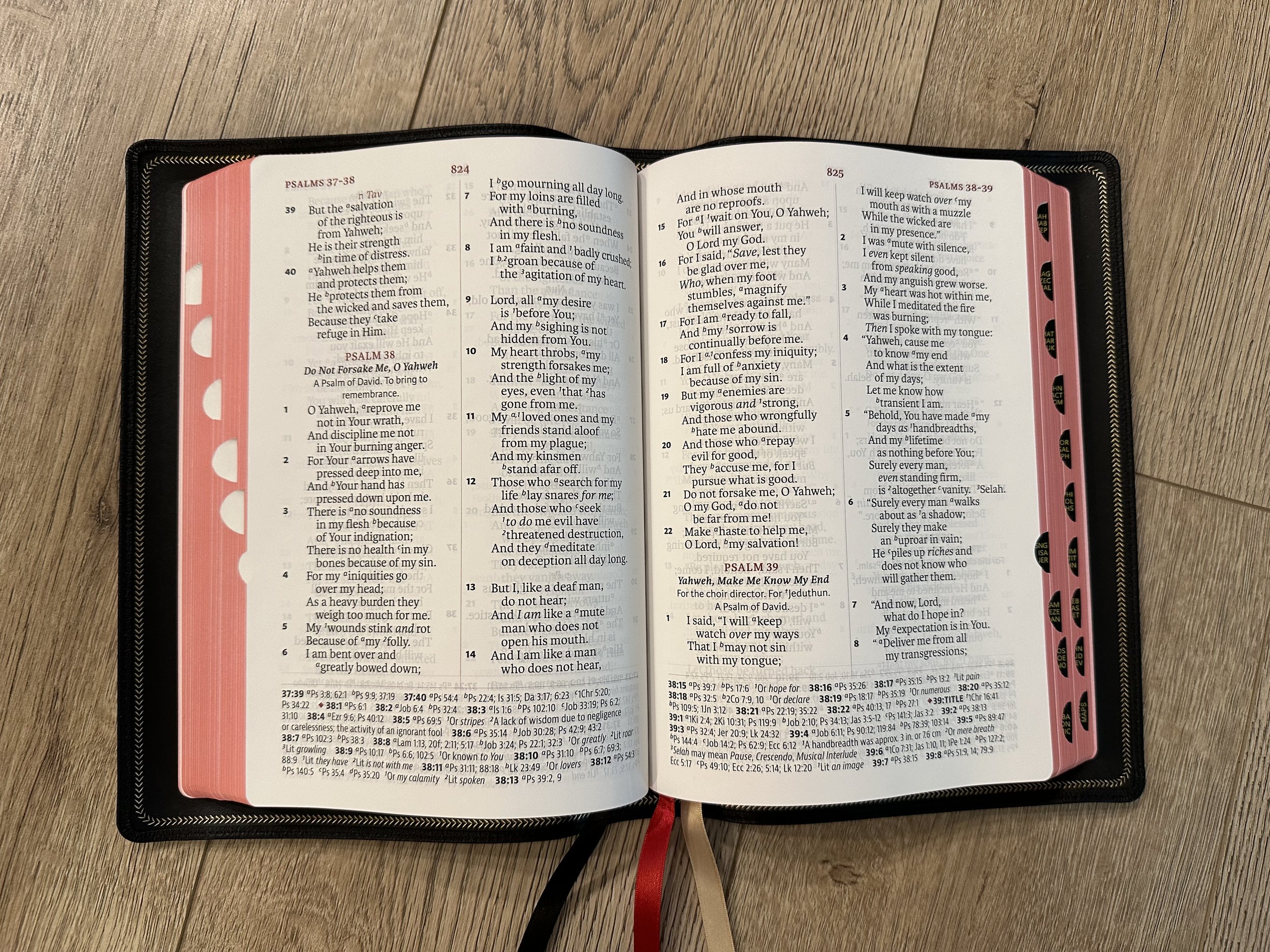If that wasn’t enough, the red under gold page edges look fantastic and the Bible I’m reviewing has thumb tabs for the index, which is a nice feature that I don’t often choose, but I do like. This Bible is also Smyth-sewn and edge-lined for durability.