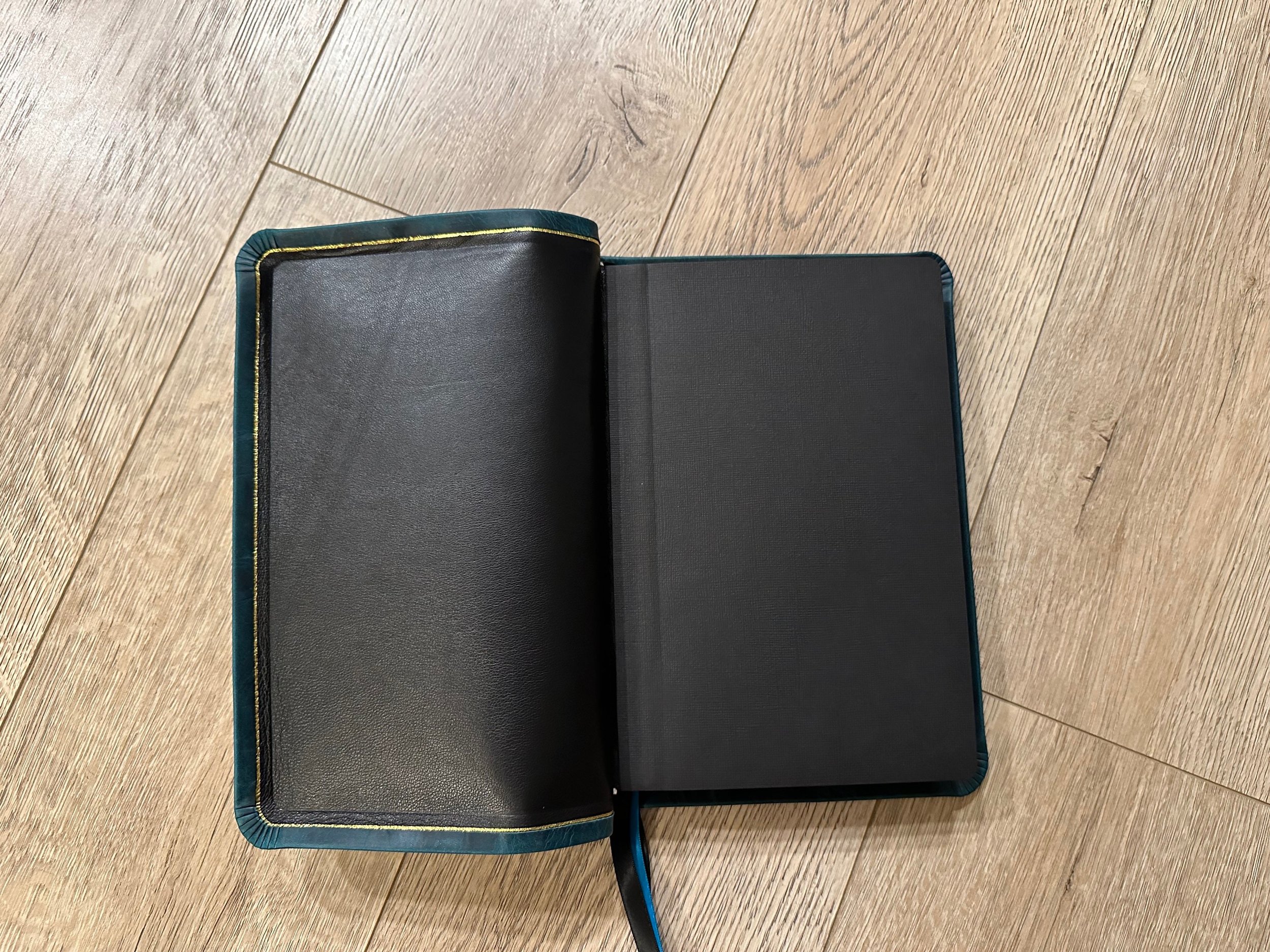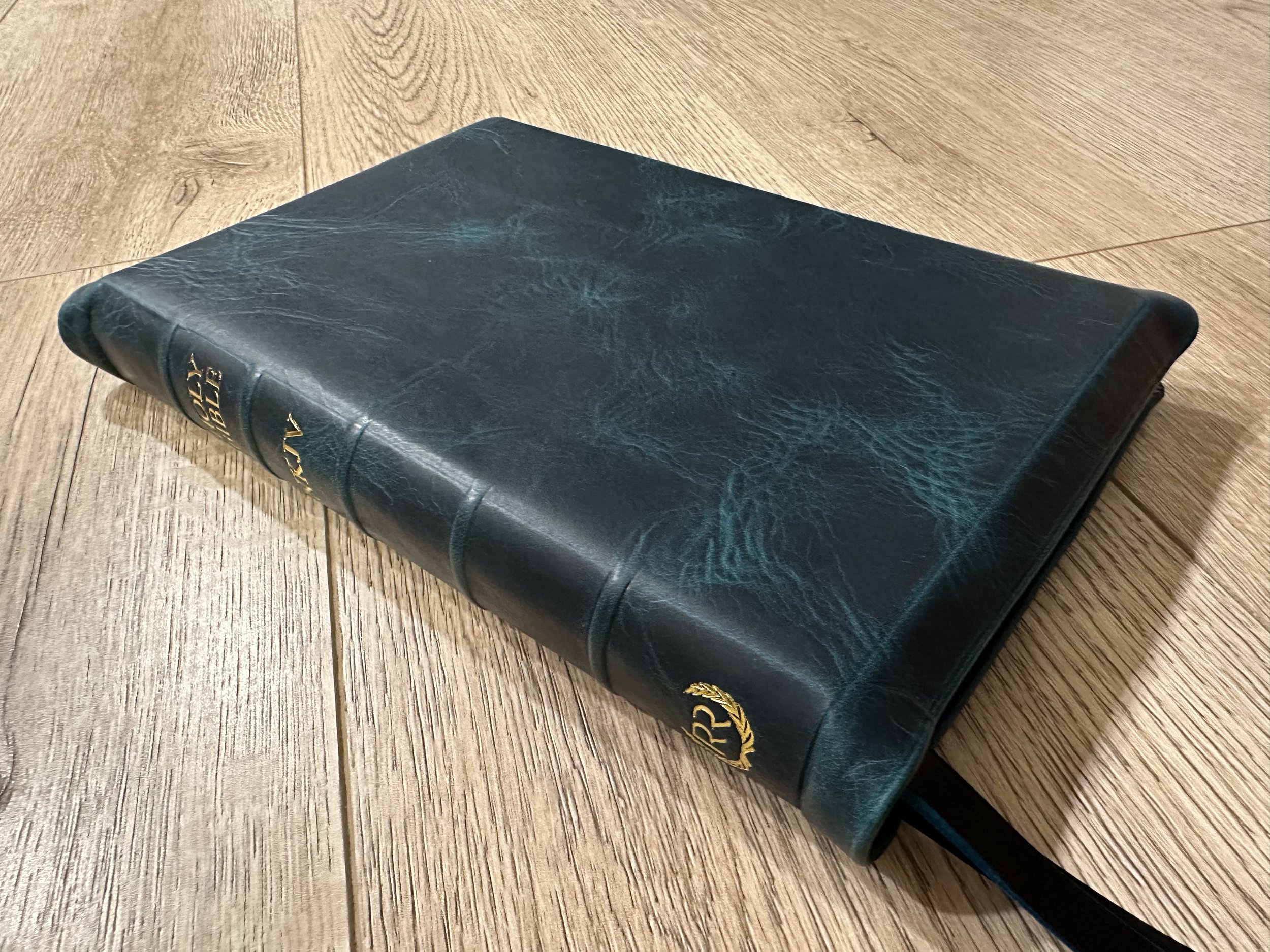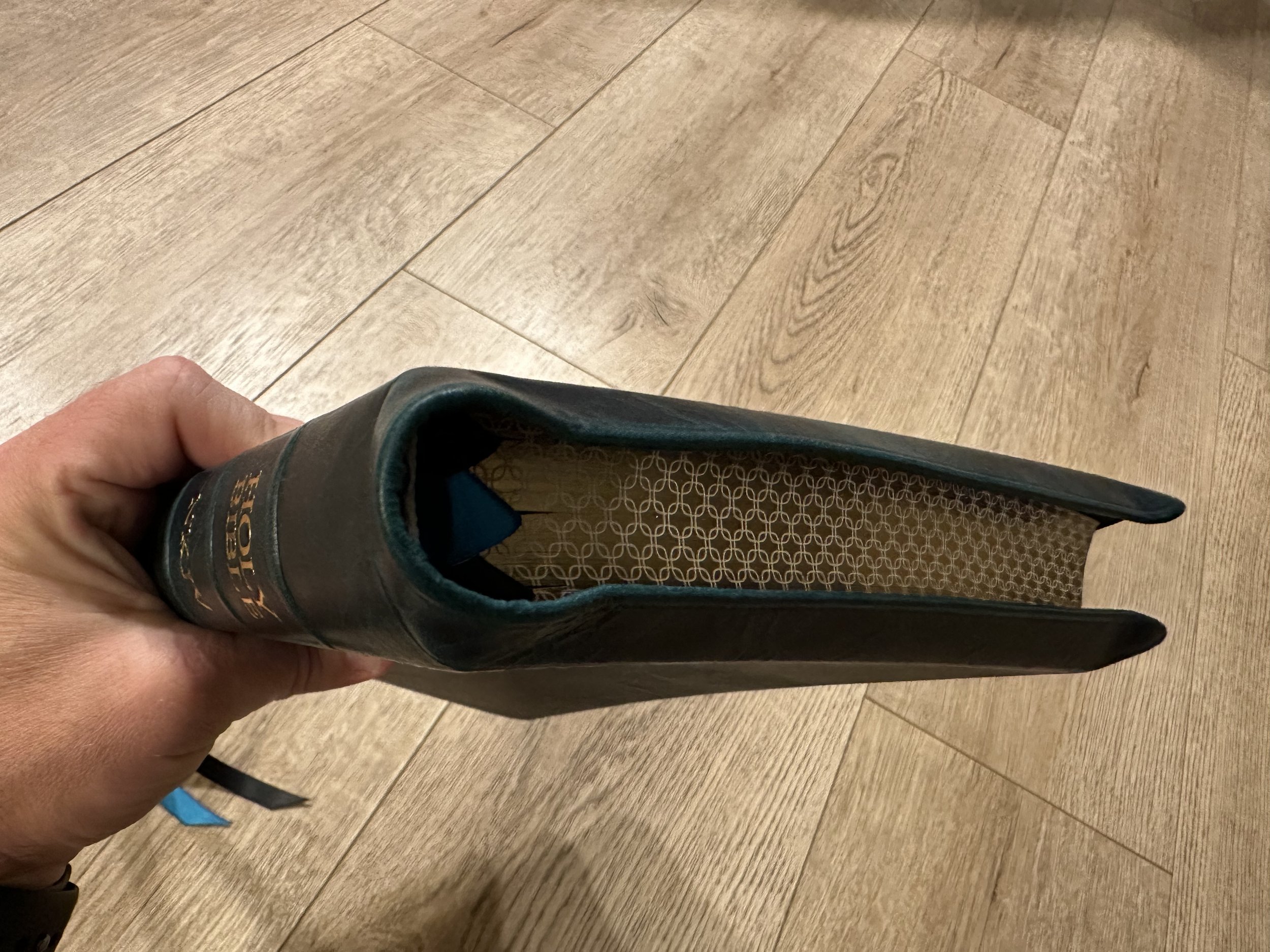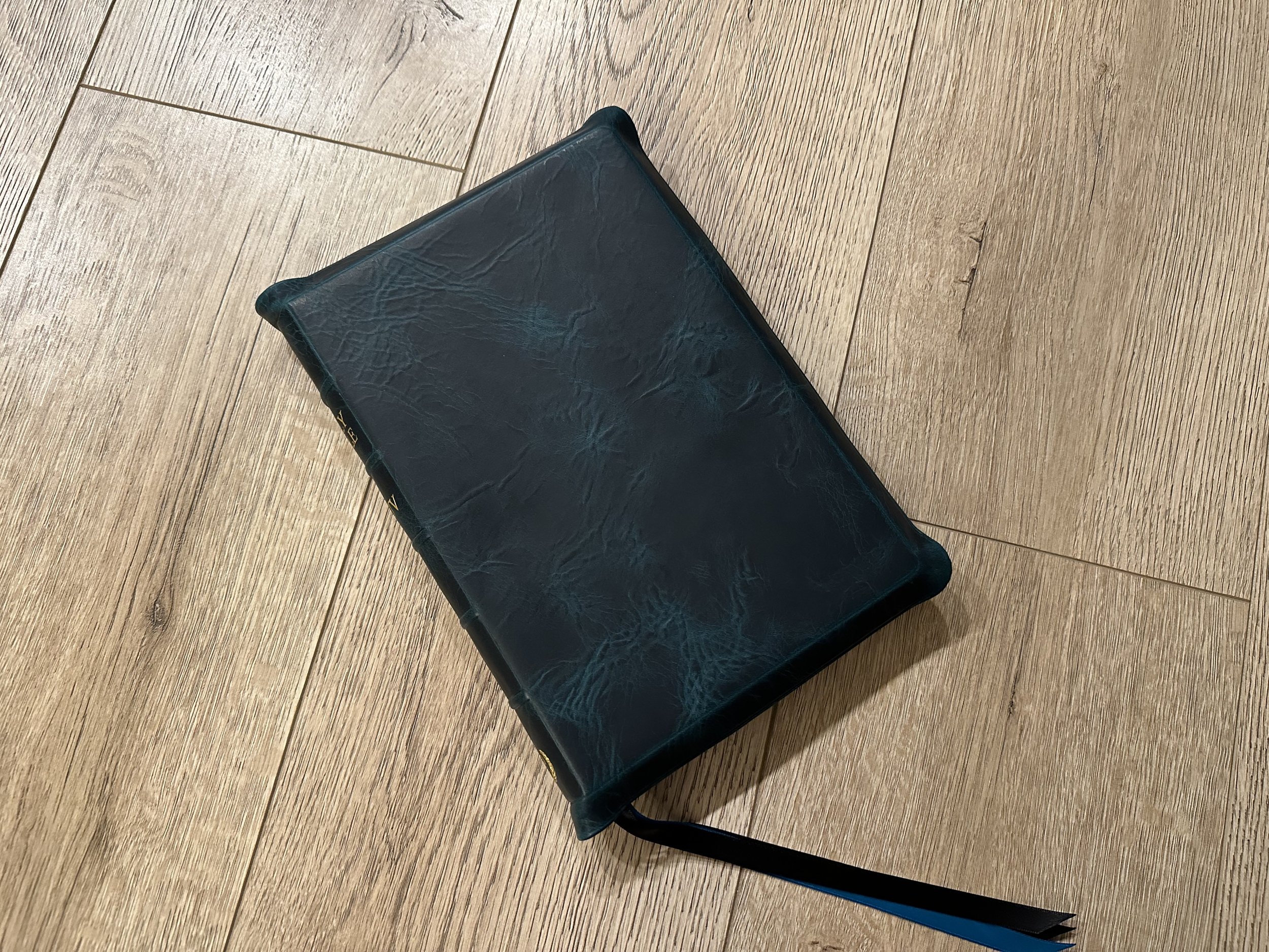 When I received this Bible, I was immediately struck by how beautiful the work is from Reformed and Rebound. This cut of leather is crazy!!! It has this raised, awesome grain that I’d never seen on this leather before. It’s really unique. I also love that this is the a really dark marbled turquoise. I’ve seen some that look more turquoise and some that look more black and then is a really nice blend.