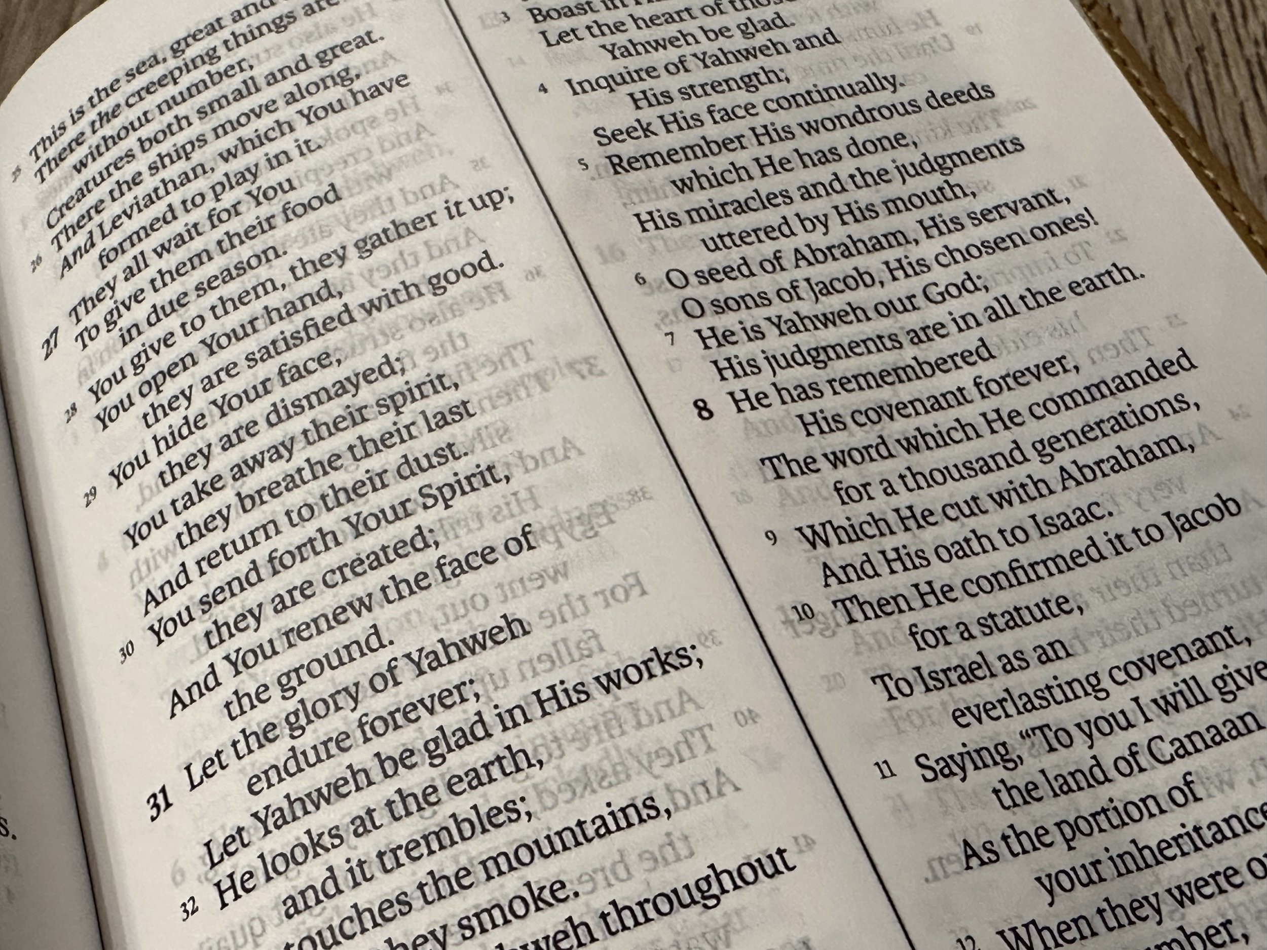 Inside the paper is a 28 gsm. There is definitely some ghosting in the poetry sections, but the paper is quite thin. This Bible features a double-column layout with a line running down the page between each column. If I’m honest, I really dislike lines running down pages in Bibles. I’m kind of surprised they did this, but I suppose it was to pack as much text in as they could since it’s a compact. The type is a generous 8.5 and it’s very readable for the size. Verse numbers are bolded to indicate new paragraphs, but otherwise they are minimized for a more immersive reading experience.