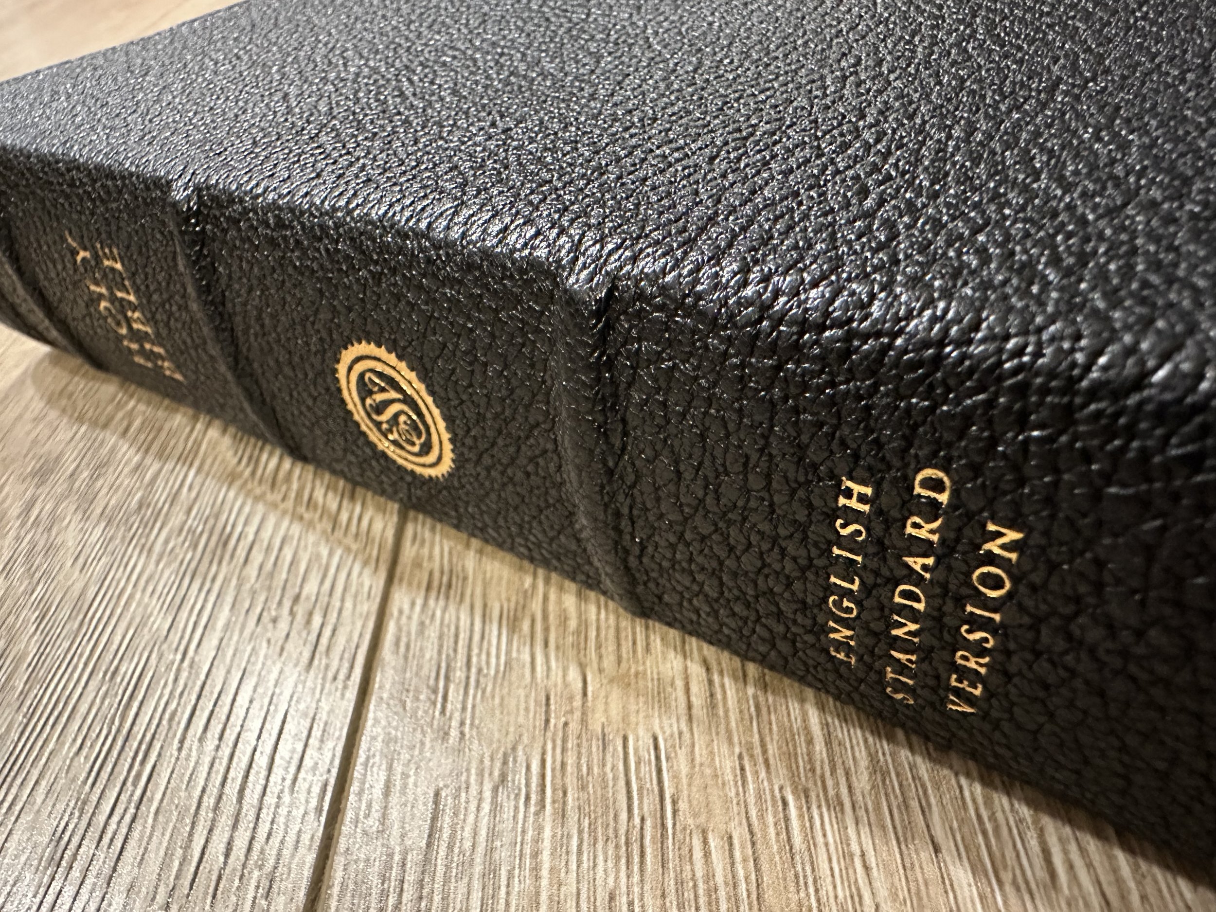 There’s just so much positive to say about this Bible. I was blown away by the grain of the goatskin. It’s not the sturdiest piece of goatskin and I’ll mention that a little more, but the grain is beautiful and the Bible itself looks beautiful. This Bible has four raised spine hubs, but what jumped out to me on the spine is that they’re still using the old ESV logo. I like that logo, but admittedly like the newer one better. Maybe it’s time for a refresh?