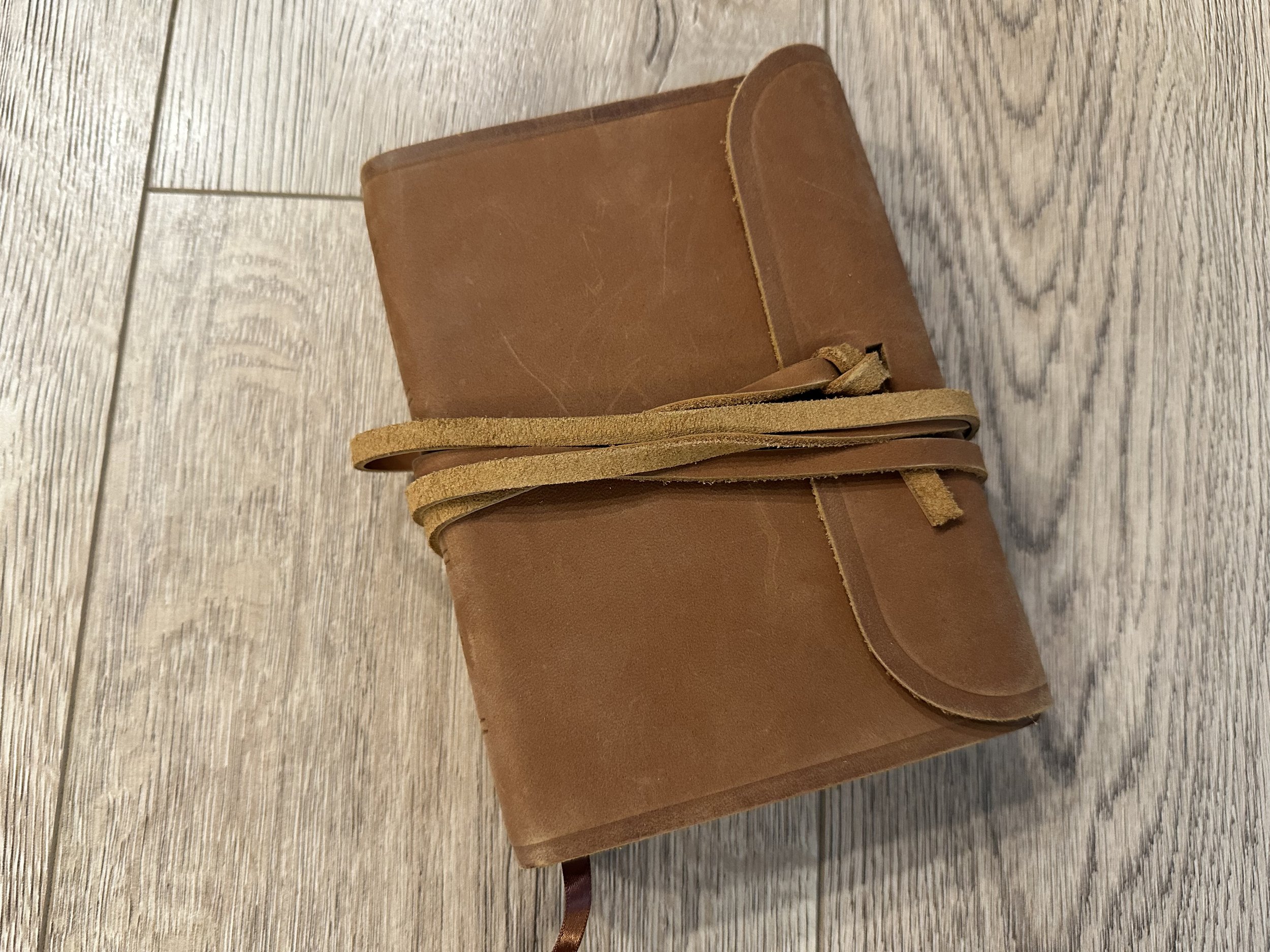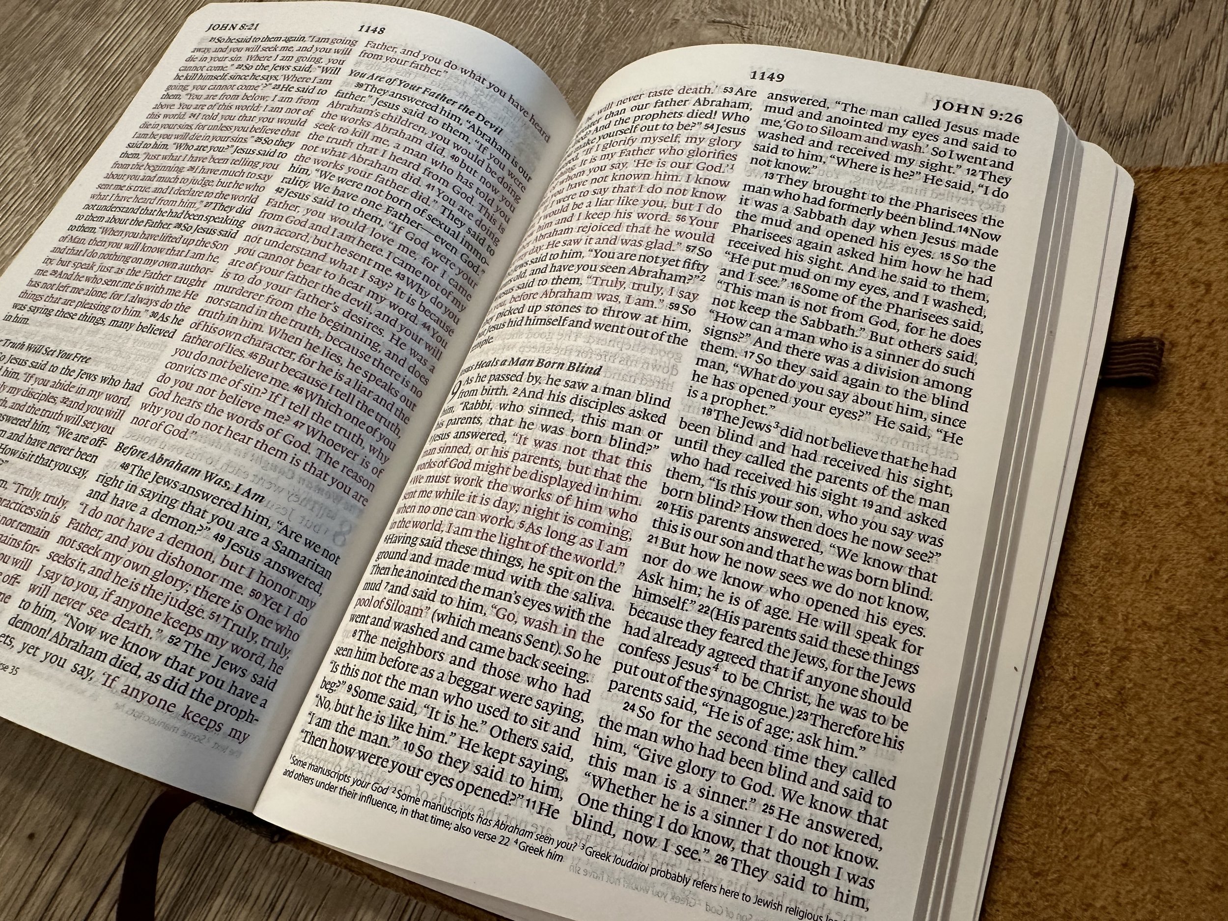 Out of the box, this Bible immediately strikes you by how unique it is. It has a fold over flap that protects the pages. You have to attach the strap yourself, but once you do, it wraps around the Bible several times to keep the cover closed. It looks unique and really cool. The natural cowhide is stunning. It’s light brown and will easily show marks and scratches. I love that! This Bible will tell the story of your use. The spine is blind stamped. The page edges are white. There’s one, small brown double-sided satin ribbon.