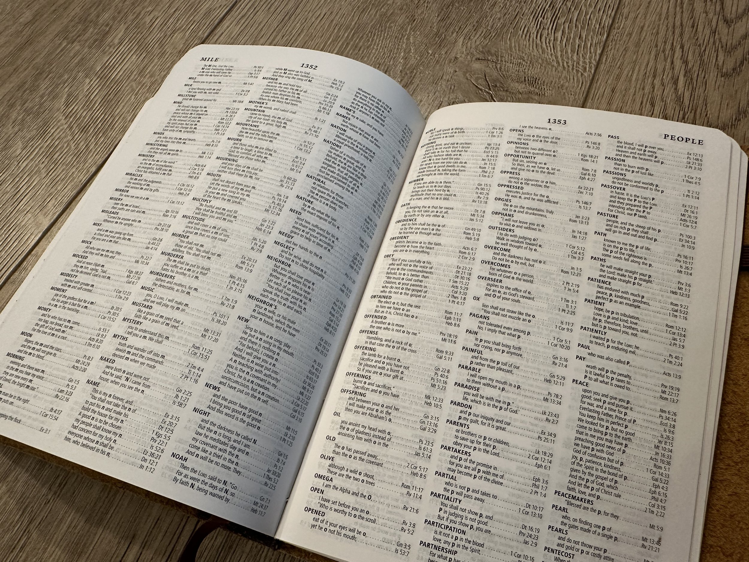There is a Concordance in the back, which is nice, but eliminating it would make this Bible smaller and more portable.