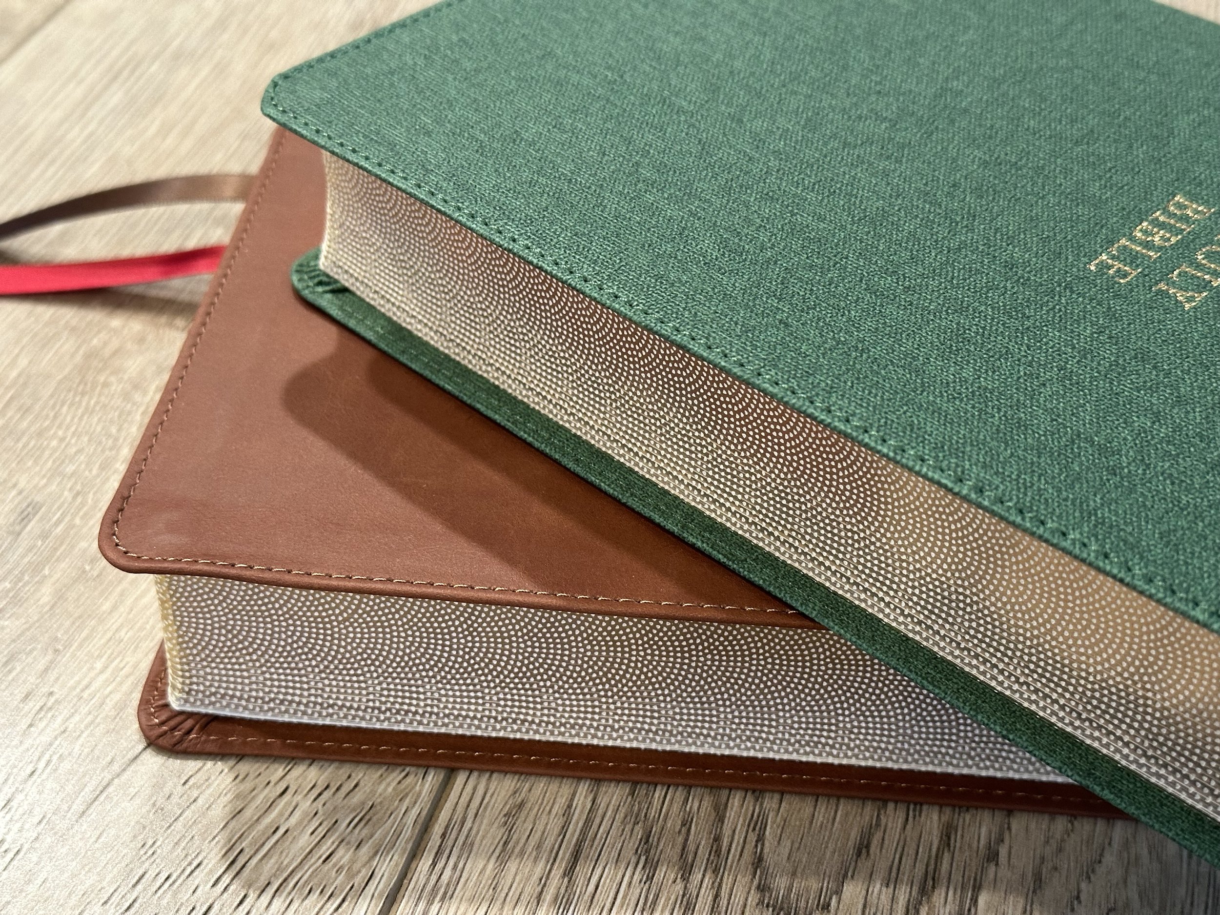 Both of these Bibles feature a really cool design on the page edges. Both have two double-sided satin ribbon bookmarks. The brown features dark brown and red as the colors and the green features a dark green and red. Both of these Bibles are Smyth-sewn for durability.