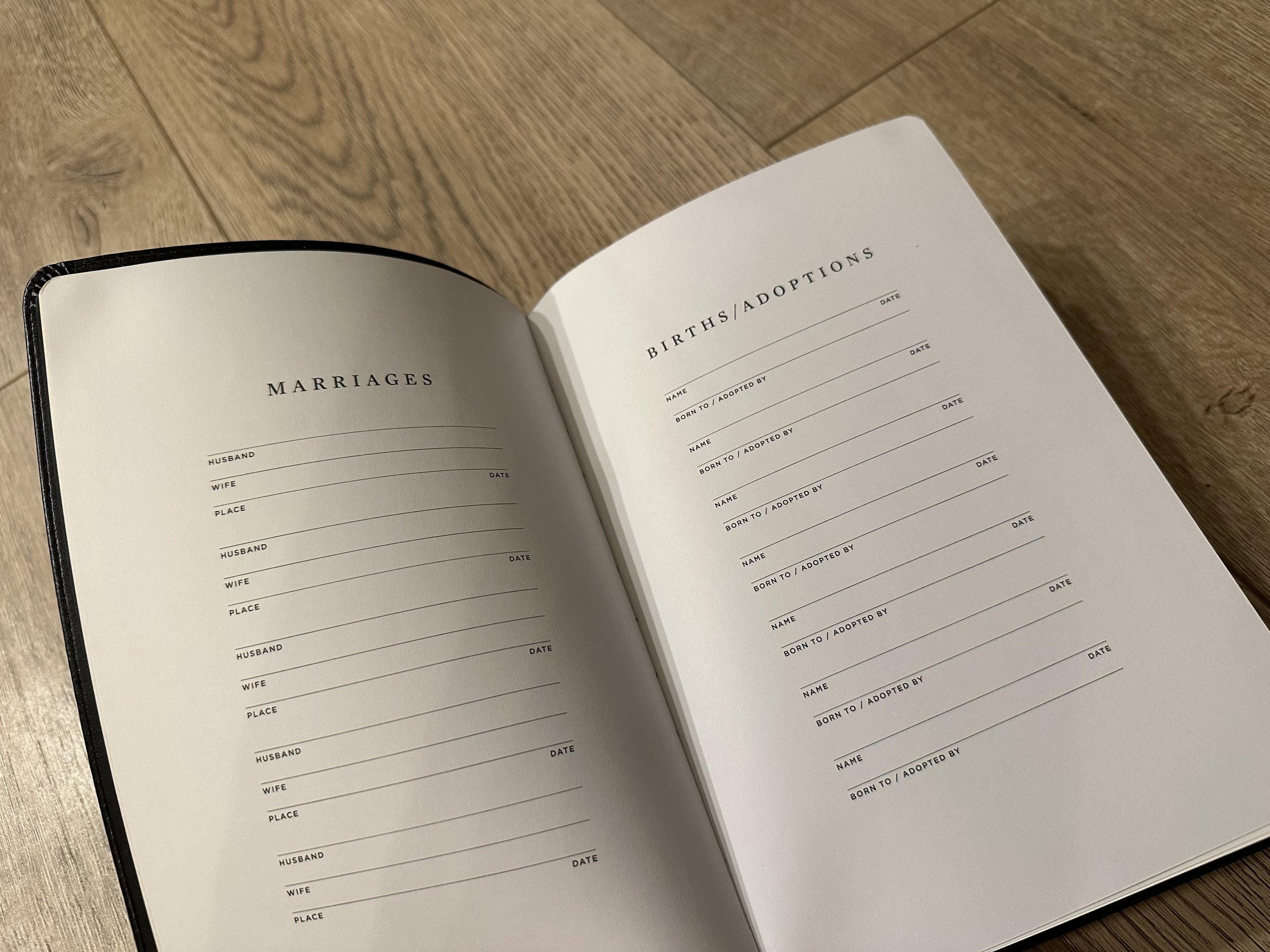 The page edges are gold and there’s single black, double-sided ribbon bookmark. Inside is a paper paste-down liner with paper end sheets. There are a few blank pages as well as family records pages. The Bible does feature a sewn binding for durability and includes a lifetime guarantee.