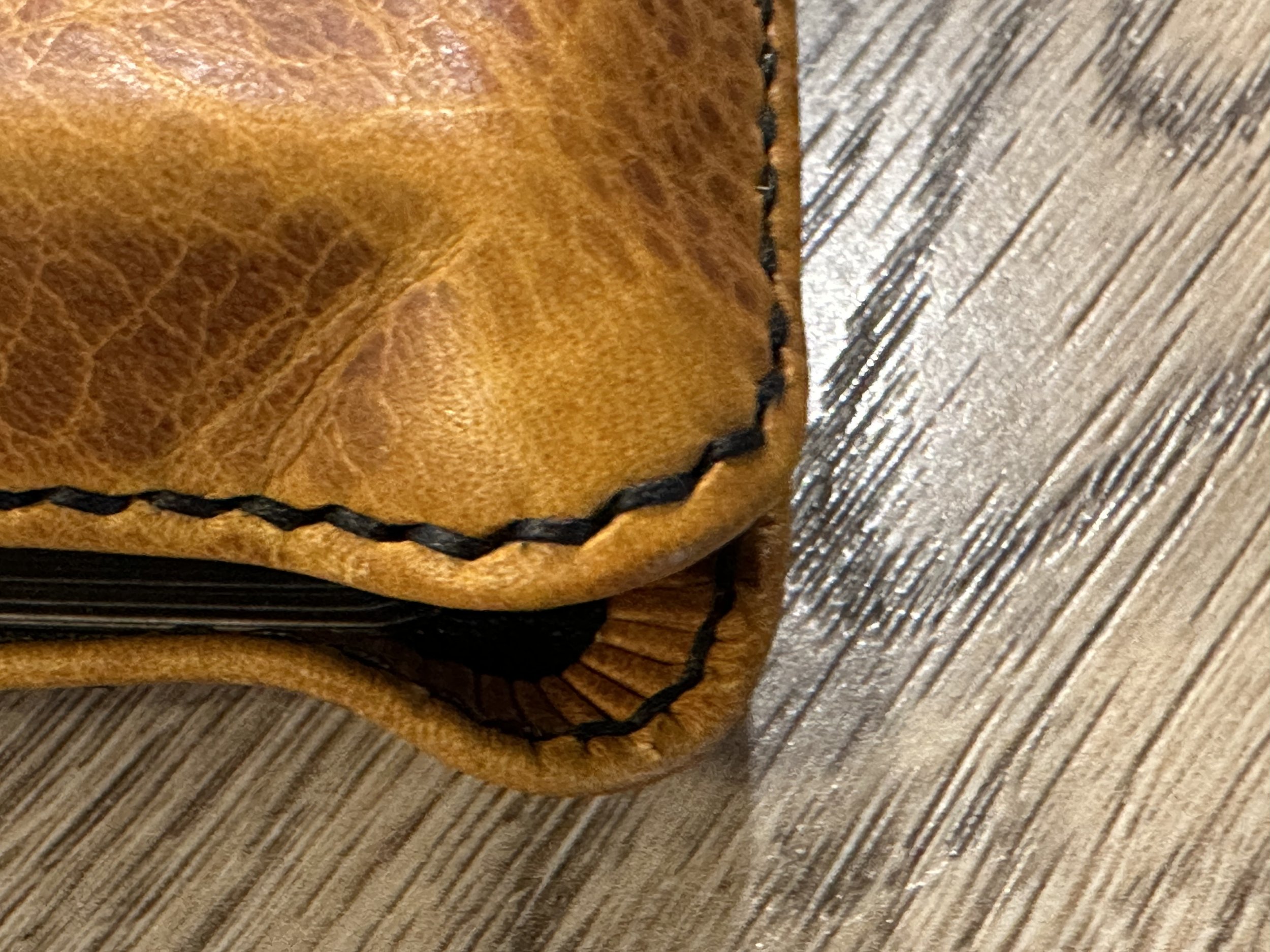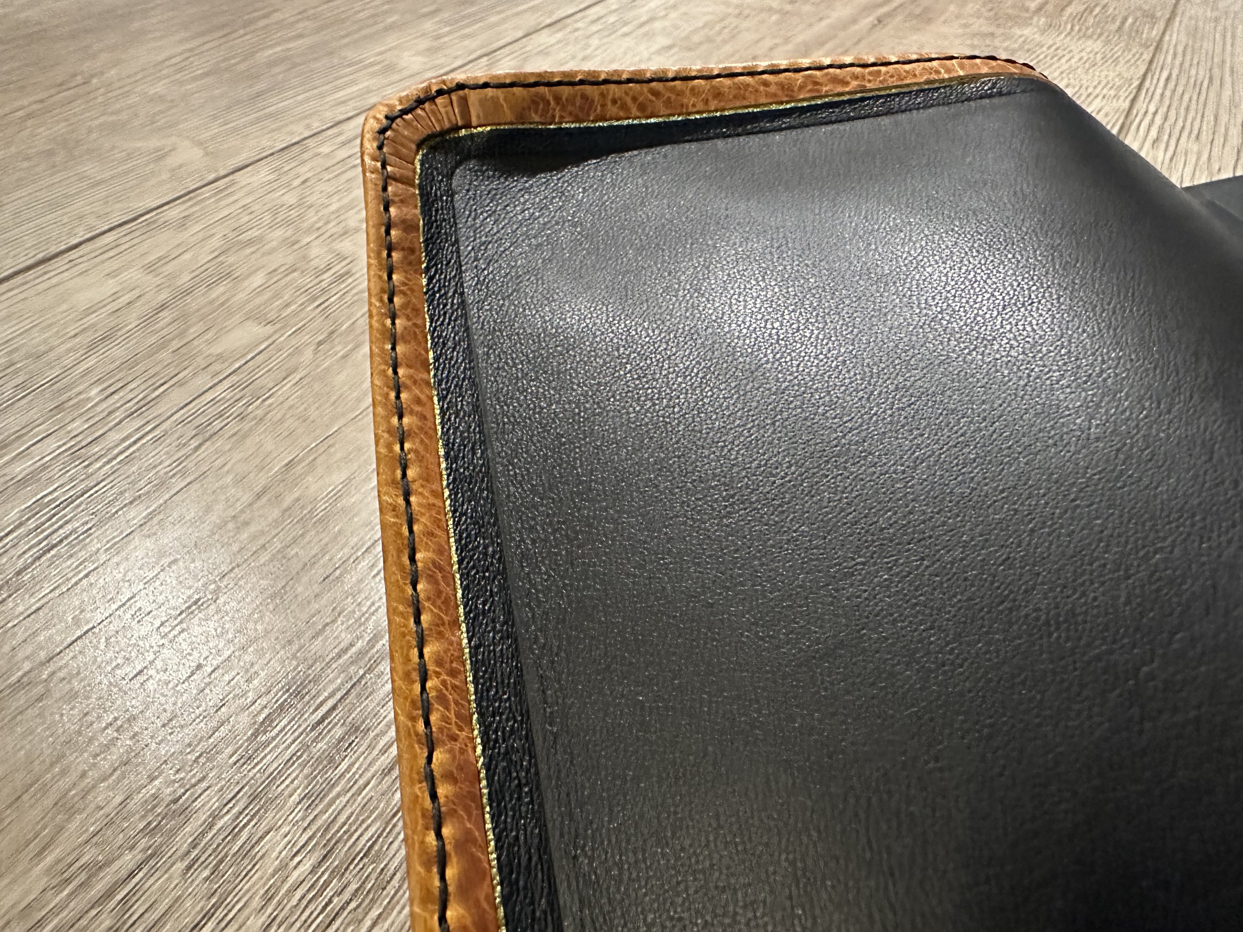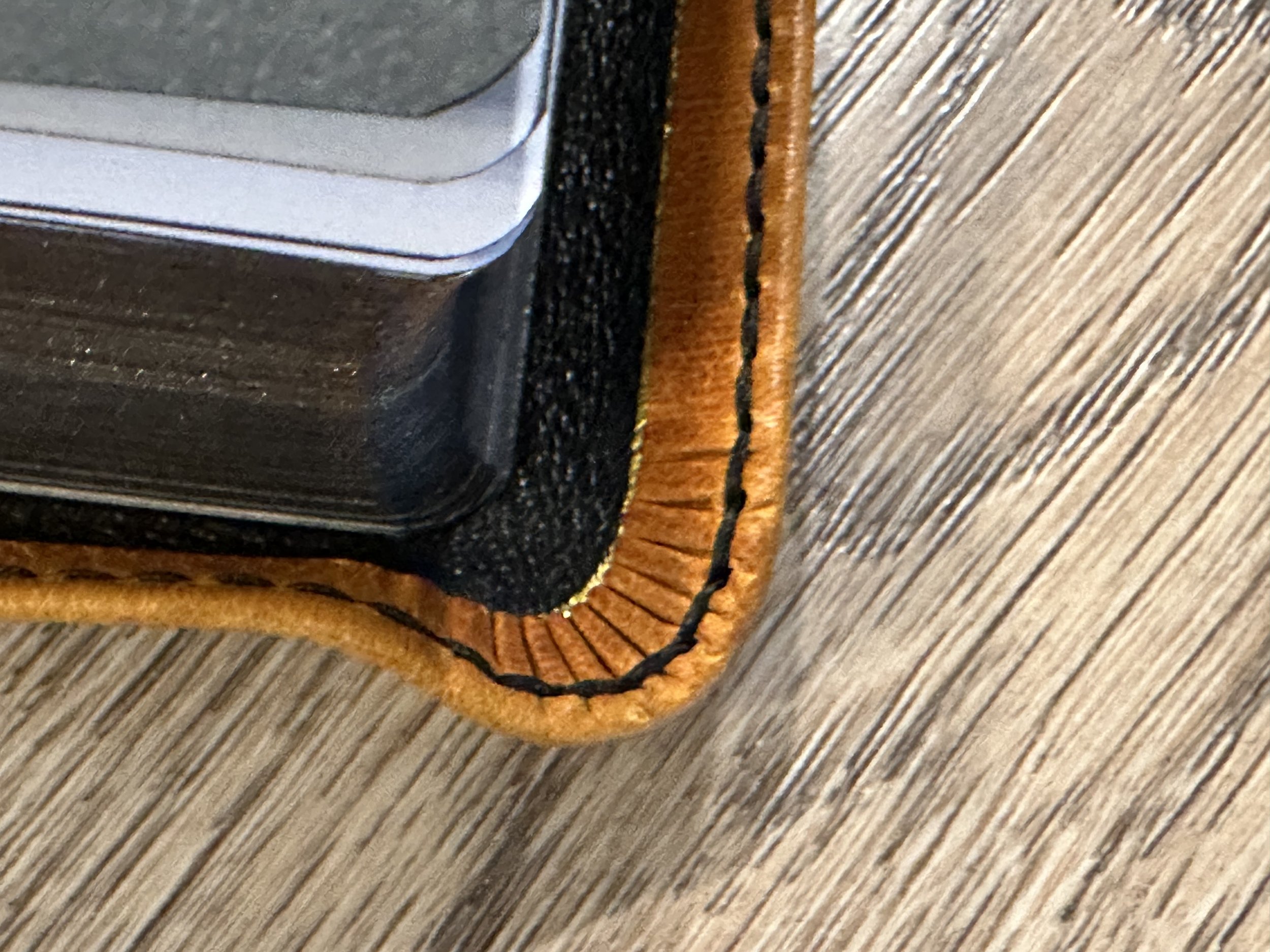 The Bible itself is stunning! I chose golden yellow badalassi with full yapp, which is my favorite leather. The grain is just incredible. The yapp meets and touches. I asked for black perimeter stitching, which really sets this Bible off! Even more, he reinforced and rounded the spine. It just looks so nice!