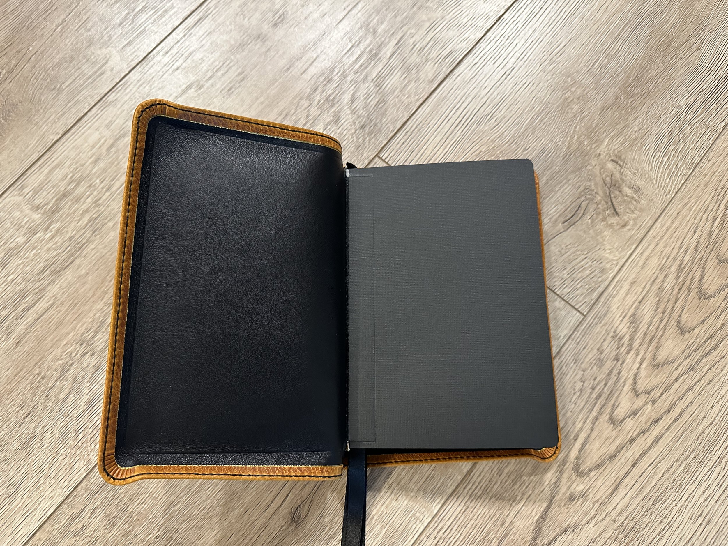 He dyed the page edges black for me, which really brings the look together. There are three double-sided satin black ribbon bookmarks. I only wanted three if they wouldn’t overlap and he did a great job just fitting them in beside one another. This little Bible is just an incredible, portable package.