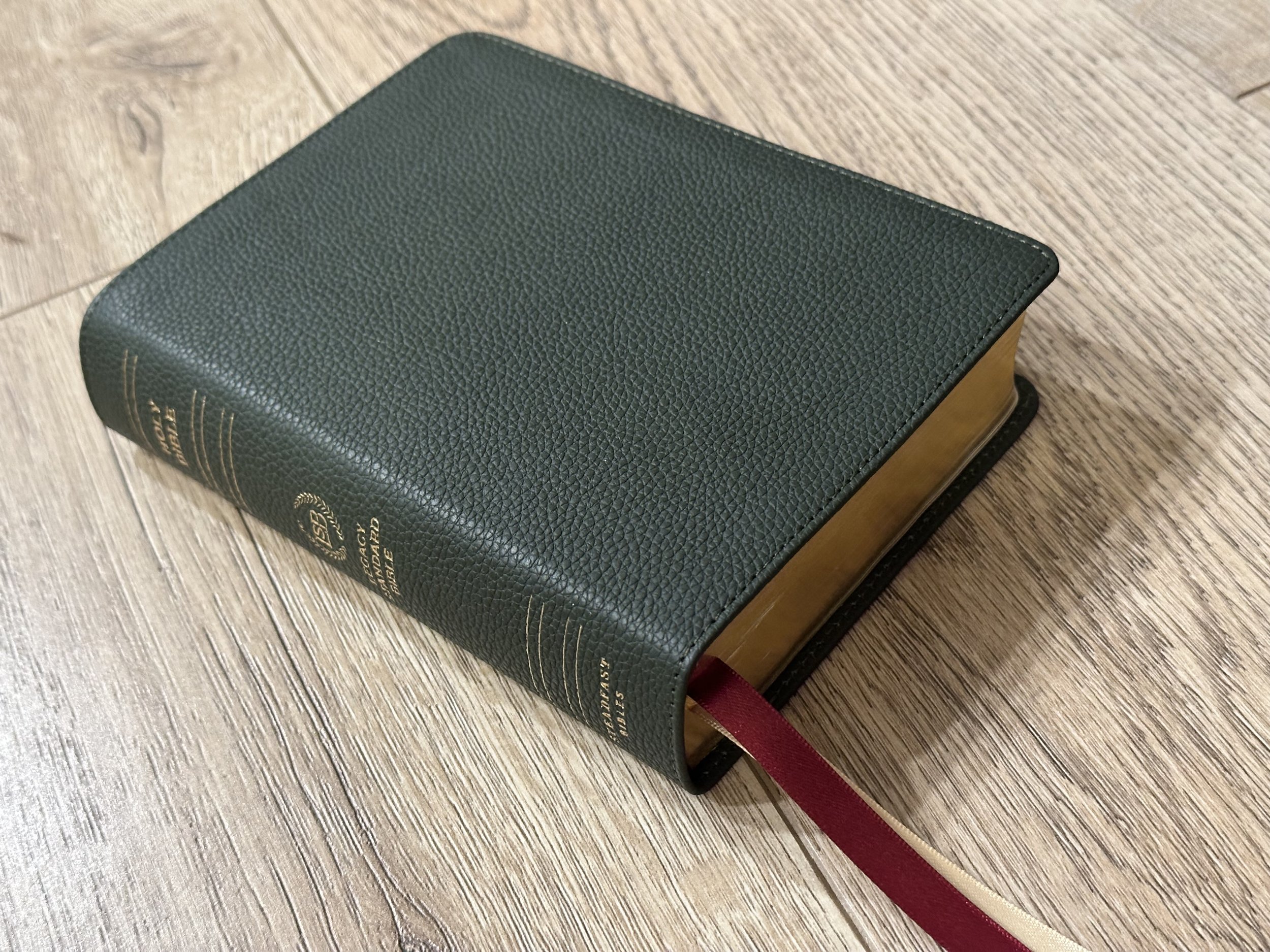 The spine has gold printing. It says, “HOLY BIBLE”, has the LSB logo, “LEGACY STANDARD BIBLE”, and “STEADFAST BIBLES at the bottom. It has gold gilded page edges with two long and wide double sided satin ribbons. One is maroon and the other is gold. The gold accents compliment this Bible nicely. It also features green head and tail bands.