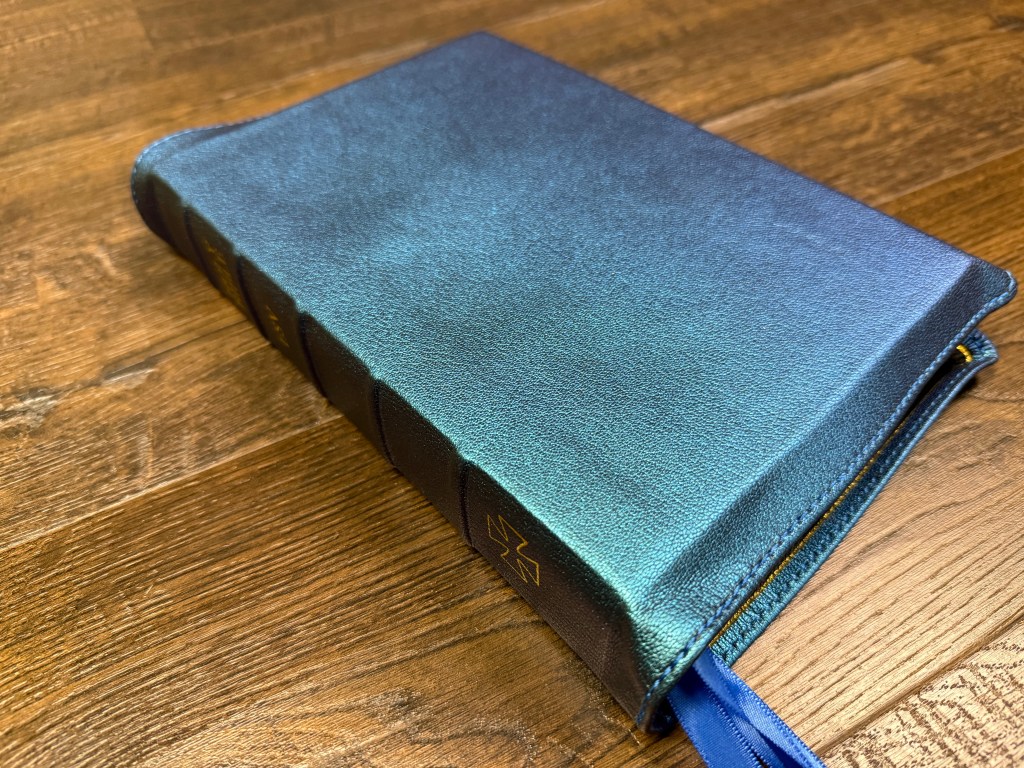 Whatever you think about the name, one thing is undeniable — this is a gorgeous Bible. The way that color shifts in the light is mesmerizing. The sole goat skin feels smooth yet tough in the hand. It’s a tactile joy to hold and read from.